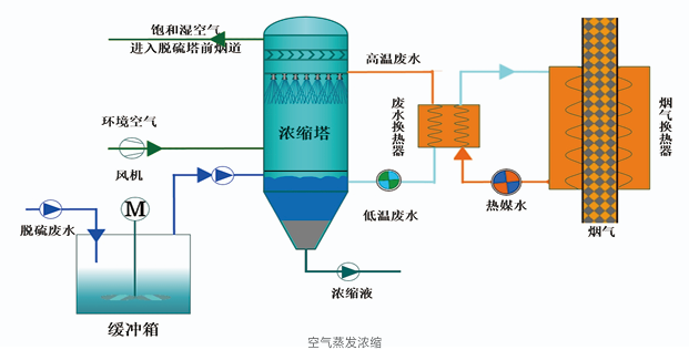 工艺流程 ●废水流程:脱硫废水经缓冲池后输送至浓缩塔;由循环泵从浓缩塔下部抽取,经浓缩塔外部废水换热器升温后,再输送至浓缩塔上部做雾化喷淋;喷淋下落的废水一部分蒸发为水蒸汽混入空气中,另一部分下落到浓缩塔下部,继续进行加热喷淋循环;达到浓缩倍率后的浓缩液,由浓缩塔下部排出。 ●热量流程:直接引用低温省煤器热媒水、低低温省煤器热媒水、凝结水或在除尘器出口和脱硫吸收塔入口之间设置烟气换热器产生热媒水等;再通过“热媒水—废水”换热器将热量转移到废水中;废水蒸发时,热量转移到水蒸汽中;最后通过水蒸汽将热量返回烟道中。 ●空气流程:少量低温环境空气经送风机提压后由浓缩塔中下部鼓入,与上部喷淋而下的热废水逆流换热,空气升温吸湿变为热饱和湿空气,经除雾器后排入脱硫塔入口烟道。 技术优势 ●安全可靠:基于“随着温度升高,水蒸汽饱和分压呈指数增大”和“不同浓度、温度下,垢物溶解度不同”的技术机理,系统安全系数高、系统设计冗余,产品采用耐温、耐腐蚀、阻燃且环保的金属材料,实现可靠运行。 ●热源灵活:热源品质要求低,可使用低温烟气余热,也可使用低品位辅助蒸汽,或者低温省煤器出口热媒水,采用低温蒸发浓缩设计理念,实现废热深度利用。 ●空气携水:基于饱和空气分压力随空气温度升高原理,空气作为携水载体,非能量载体,空气量小,安全环保的实现废水浓缩减量。 ●无结垢危害:基于晶种法和物理冲刷,采用精准控制系统,通过控制浓缩塔内浓缩倍率和喷淋温度,避免设备结垢。 ●布局灵活:可实现多炉一机设计,系统布置灵活,占地小。