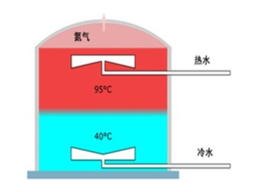 热水和冷水由于水温不同而密度不同,自然分层。 蓄热时,热水通过上布水器从上部流入,冷水通过下布水器从下部流出; 放热时,热水通过上布水器从上部流出,冷水通过下布水器从下部流入。