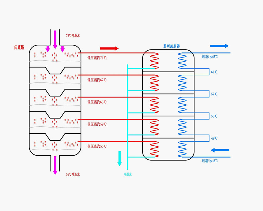 梯级利用:闪蒸塔采用多级蒸发,使冲渣水余热能够梯级利用,冲渣水和热网水接近逆流换热。